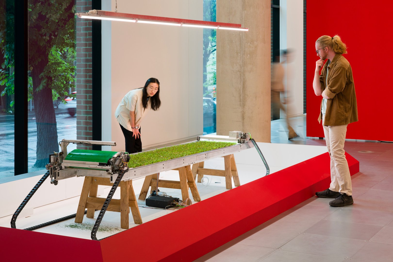 The installation is a robot lawn mower that continuously mows a small section of grass ensure that the grass is kept at the perfect length.