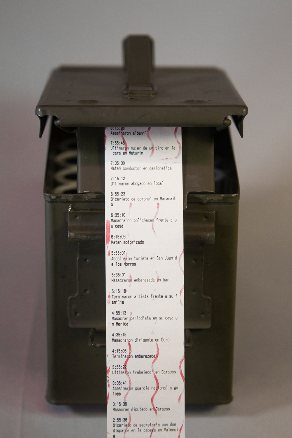 This installations is an experiemental infographic machine that depicts the frequency of murders in Venezuela through hypothetical murder reports.